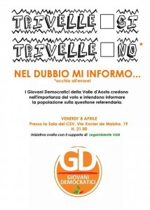 Il referendum sulle trivellazioni in mare si avvicina, nel quasi totale silenzio dell’informazione. Convintamente schierati per il Sì, siamo coscienti che le persone debbano essere, prima di tutto, informate per poter scegliere. Perciò abbiamo volentieri accettato l’invito dei Giovani Democratici ad organizzare il dibattito di cui pubblichiamo la locandina, e al quale invitiamo tutti, ma soprtattutto i giovani, a partecipare.